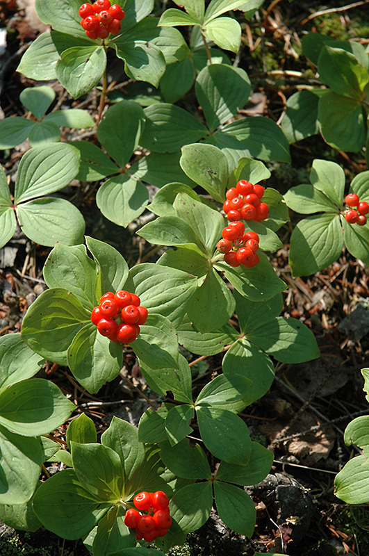 Bunchberry has creamy white star-shaped flowers with white bracts at the ends of the branches from late spring to early summer, which are interesting on close inspection. The red fruits are held in abundance in spectacular clusters from mid summer to early fall. It has dark green evergreen foliage. The pointy leaves turn an outstanding brick red in the fall, which persists throughout the winter.